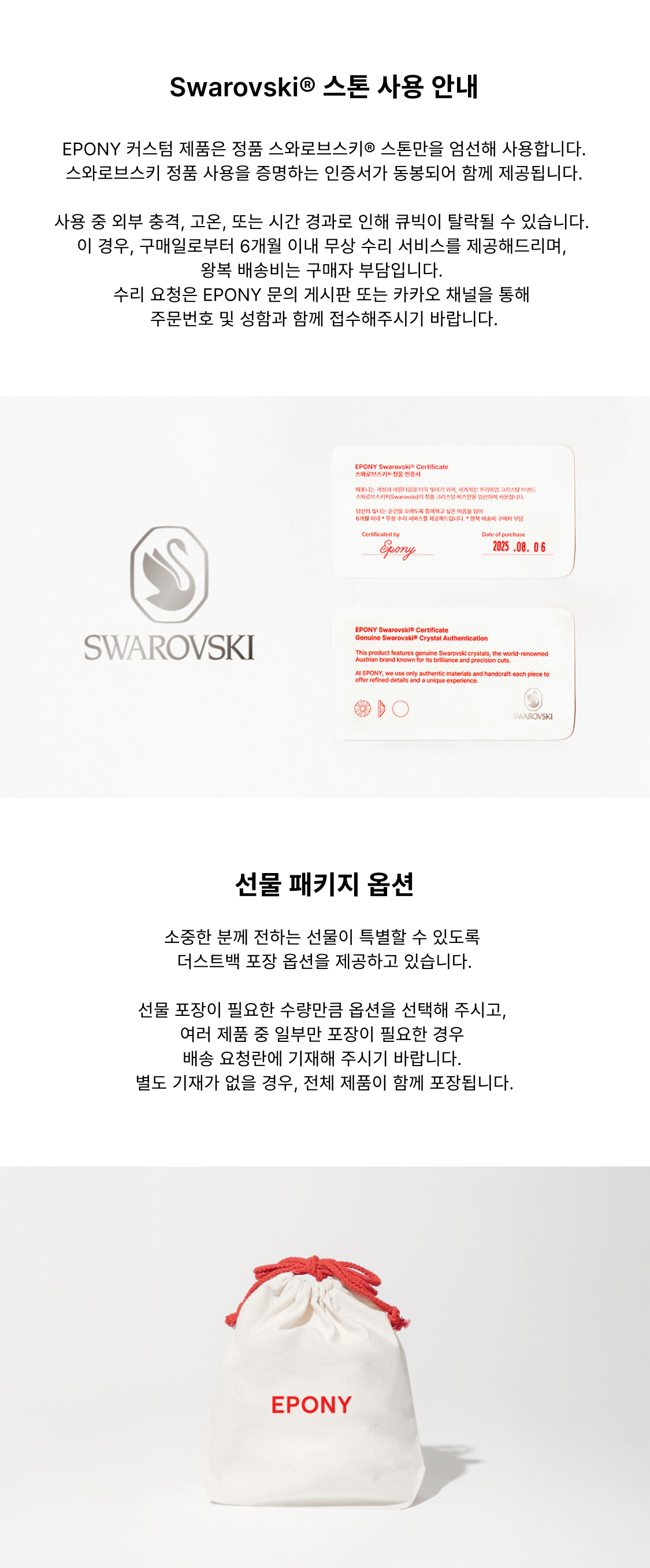EPONY 커스텀 폰케이스는 Swarovski® 정품 크리스탈을 사용하여 정교하고 고급스러운 반짝임을 선사합니다. 유리처럼 반짝이는 글라스 재질과 측면의 TPU 범퍼가 결합되어 일상 속 충격으로부터 기기를 보호합니다.