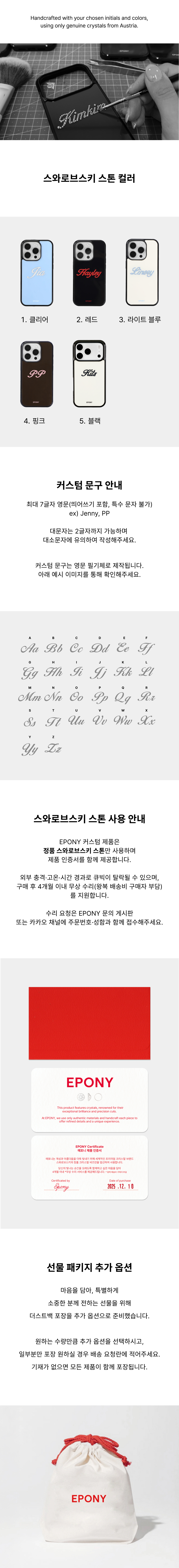 EPONY 커스텀 폰케이스는 스와로브스키 정품 크리스탈을 사용하여 정교하고 고급스러운 반짝임을 선사합니다. 유리처럼 반짝이는 글라스 재질과 측면의 TPU 범퍼가 결합되어 일상 속 충격으로부터 기기를 보호합니다.
